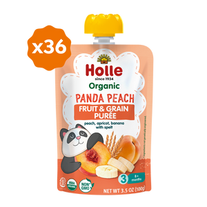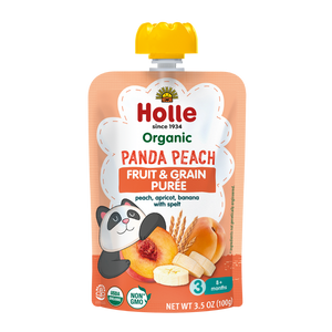 The Panda Peach variety is a tasty blend of organic peach, banana, apricot, and spelt. All Holle Organic Fruit & Grain Purées offer finely pureed organic fruit and grains grown on regenerative farms without any added salt or refined sugar.Holle pouches are made with USDA organic, non-GMO, Demeter-certified biodynamic ingredients. Plus, the resealable pouch makes it perfect for on-the-go snacking. Holle's Panda Peach Organic Fruit & Grain Puree is a tasty snack for babies 8 months and up.