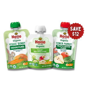 This variety bundle includes both fruit and veggie pouches and yogurt pouches. All Holle fruit and veggie pouches are made with biodynamic fruits and veggies grown on regenerative farms. Holle yogurt pouches are made with organic grass-fed yogurt. Both kinds of pouches are made without added sugar, preservatives, or artificial ingredients.