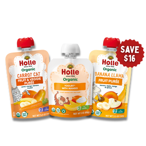 This variety bundle includes both fruit and veggie pouches and yogurt pouches. All Holle fruit and veggie pouches are made with biodynamic fruits and veggies grown on regenerative farms. Holle yogurt pouches are made with organic grass-fed yogurt. Both kinds of pouches are made without added sugar, preservatives, or artificial ingredients.